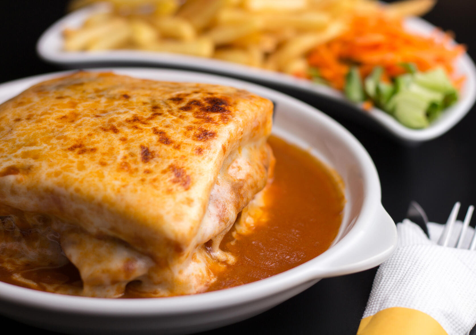 Febra de porco, alhiera, bacon, batata palha, pão, queijo e molho de francesinha.