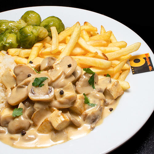 **Prato Vegetariano - **Tofu com cogumelos salteados, com molho de natas e cerveja.