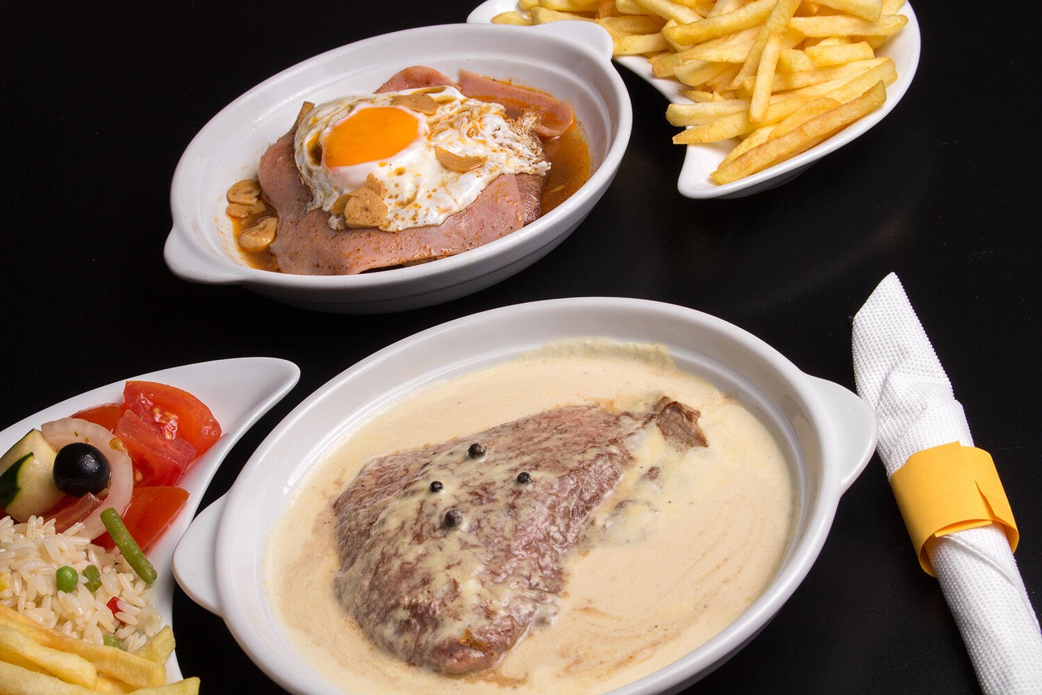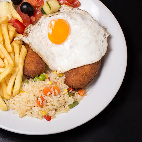 O clássico bife com ovo a cavalo, com opção entre quarto carnes, Novilho, Porco, Peru ou Frango.