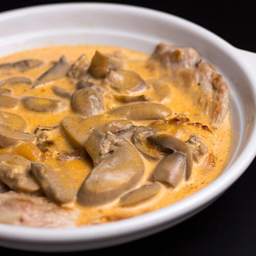 Bife de Frango, Peru ou Porco, com molho de natas e cogumelos.