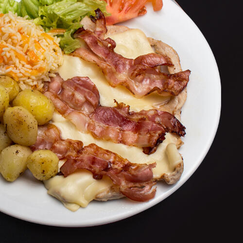 Febra de Porco com bacon e queijo.