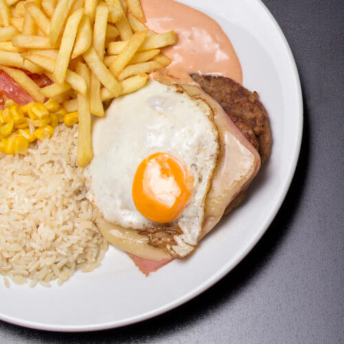 Dois hambúrgueres com fiambre, queijo, ovo s cavalo e Molho Especial.